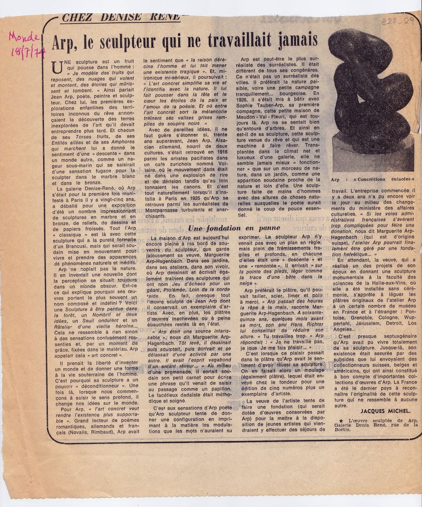 Απόκομμα, έντυπο, χαρτί, 24,7×21,7 εκ., όπου δημοσιεύεται, στα γαλλικά, κριτική του Jacques Michel για την έκθεση έργων γλυπτικής του Jean Arp στο Παρίσι τον Ιούλιο του 1974. Αριστερά, επιγραφή με τα στοιχεία δημοσίευσης.
