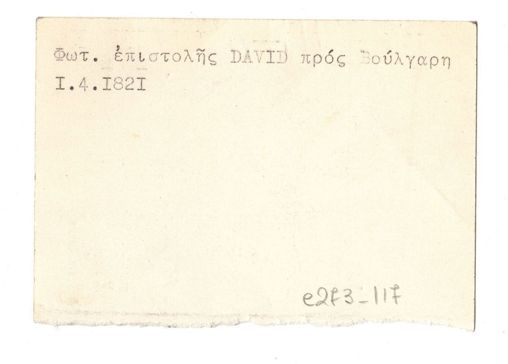 Απόκομμα, έντυπο, χαρτόνι, 7,0×10,0 εκ. Τμήμα πρόσκλησης έκθεσης του Karel Apel στην Ιταλία το 1971. Στην πίσω όψη δακτυλόγραφη σημείωση, σχετικά με φωτογραφία (;) επιστολής του David προς τον Βούλγαρη στις 1.4.1821.