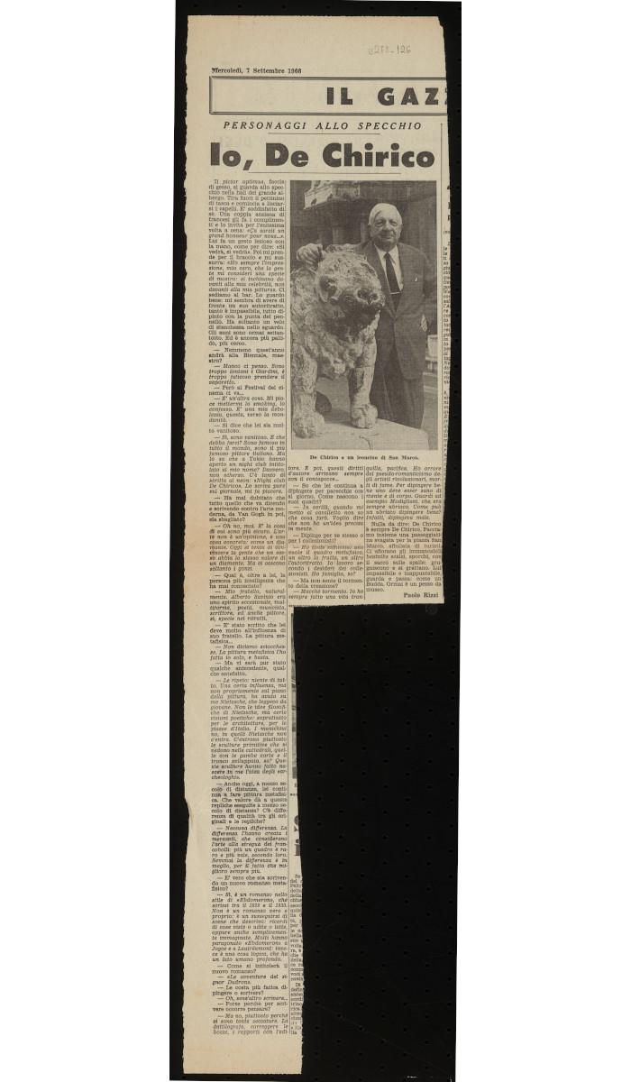 Απόκομμα, έντυπο, χαρτί, 60,0×14,5 εκ. (ακανόνιστο σχήμα), όπου δημοσιεύεται, στα ιταλικά, συνέντευξη του Paolo Rizzi με τον τον Ιταλό σουρεαλιστή ζωγράφο Giorgio de Chirico.