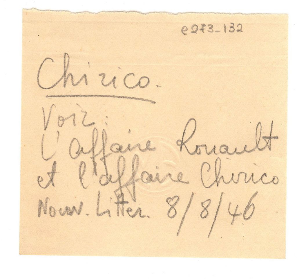 Απόκομμα, χαρτί, 8,2×9,0 εκ., με βιβλιογραφική παραπομπή, χειρόγραφη, με μολύβι, στα γαλλικά. Άρθρο στην εφημερίδα LES NOUVELLES LITTÉRAIRES (08/08/1946) με αναφορές στον Ιταλό ζωγράφο Giorgio De Chirico και τον Γάλλο ζωγράφο Georges Rouault.