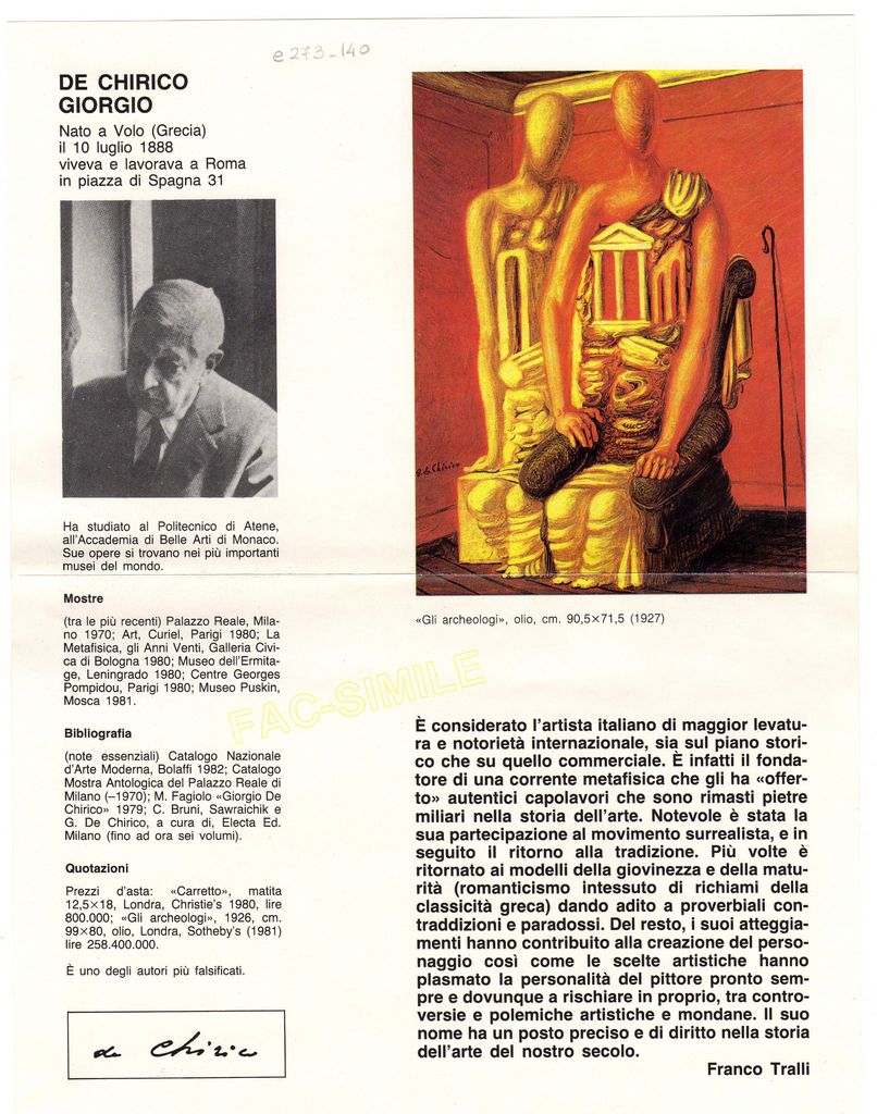 Έντυπο, στα ιταλικά, χαρτί ιλουστρασιόν, 25,5×19,5 εκ. Φυλλάδιο με πληροφοριακό υλικό για τον Ιταλό ζωγράφο Giorgio de Chirico. Περιέχει βιογραφικά στοιχεία, κυριότερες εκθέσεις, βιβλιογραφία και αναφορές καθώς επίσης και κείμενο για τον καλλιτέχνη του κριτικού τέχνης Franco Tralli.