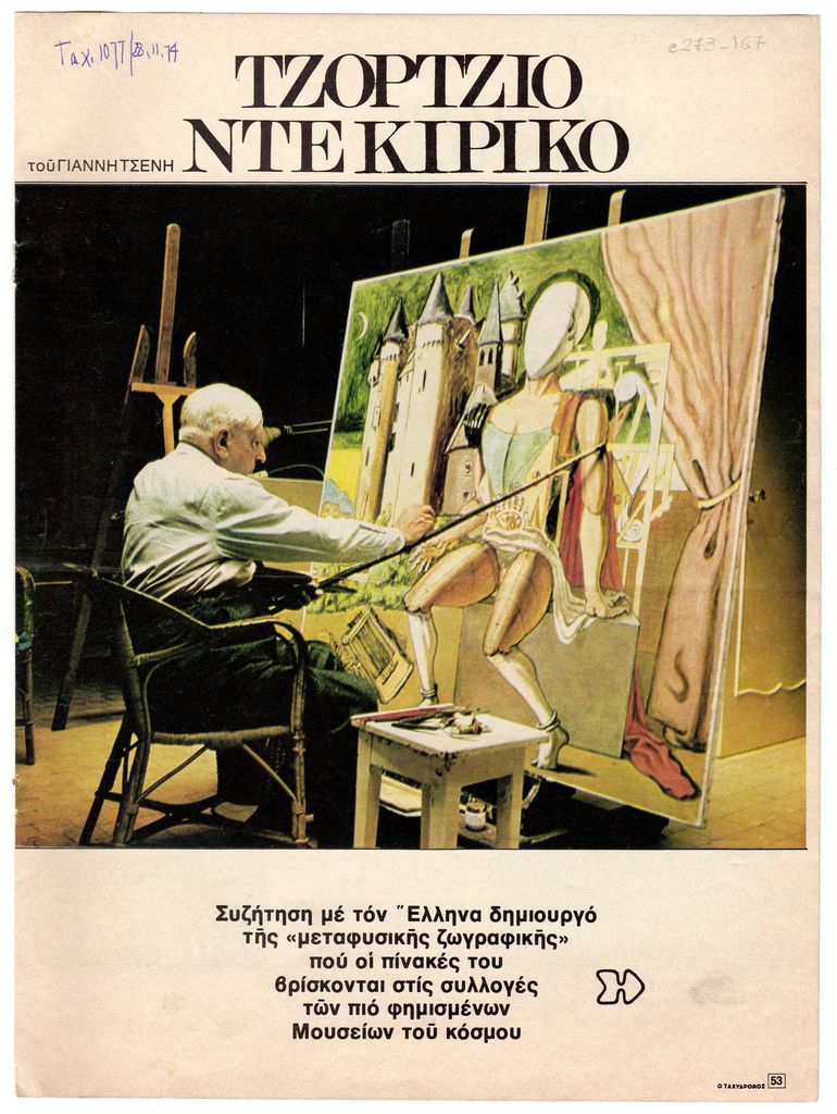 Απόκομμα, έντυπο, χαρτί εφημερίδας, δισέλιδο, 32,5×24,3 εκ., όπου δημοσιεύεται, στα ελληνικά, συνέντευξη του Ιταλού ζωγράφου Giorgio de Chirico στον Γιάννη Τσένη. Στην πρώτη σελίδα, επιγραφή με τα στοιχεία της δημοσίευσης.