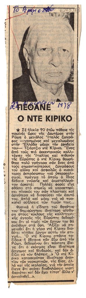 Απόκομμα, έντυπο, χαρτί, 20,7×5,5 εκ., όπου δημοσιεύεται, στα ελληνικά, η είδηση του θανάτου του Ιταλού καλλιτέχνη Giorgio de Chirico. Επάνω, επιγραφή με τα στοιχεία της δημοσίευσης.