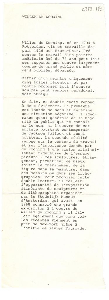 Κείμενο, δακτυλόγραφο, με μαύρο μελάνι, στα γαλλικά, σε απόκομμα χαρτιού, 29,8×11,6 εκ. Κείμενο για το έργο του Ολλανδού ζωγράφου Willlem De Kooning.