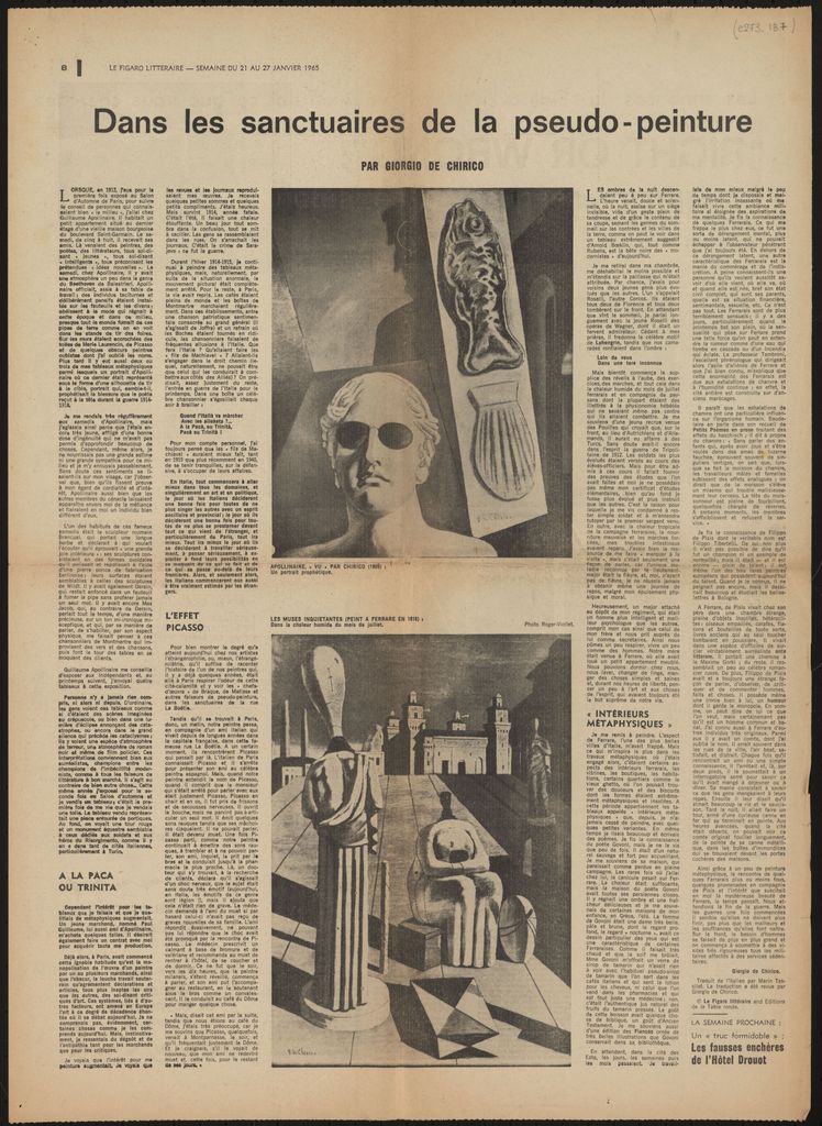 Απόκομμα, έντυπο, χαρτί, 1 τμήμα και 1 φύλλο: 32,0×20,0 εκ. και 60,0×43,5 εκ., όπου δημοσιεύεται, στα γαλλικά, κείμενο του Giorgio de Chirico για τη ζωή, τις επαφές του με άλλου καλλιτέχνες και το έργο του. Στην άλλη όψη δημοσιεύεται το άρθρο του Emmanuel D’Astier “Right or Wrong Churchill!”