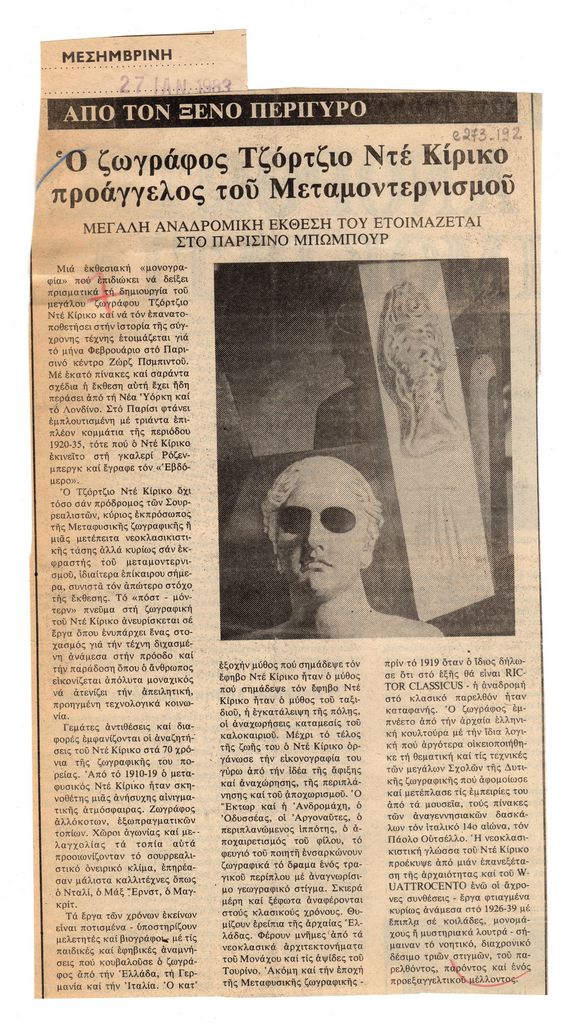Απόκομμα, έντυπο, χαρτί, 28,0×15,0 εκ., όπου δημοσιεύεται, στα ελληνικά, άρθρο για τον Ιταλό ζωγράφο Giorgio de Chirico με αφορμή τη μεγάλη αναδρομική έκθεση έργων του στο Παρίσι το 1983. Γίνεται αναφορά στα στάδια του καλλιτεχνικού του έργου. Επάνω, επικολλημένο απόκομμα με τα στοιχεία της δημοσίευσης.