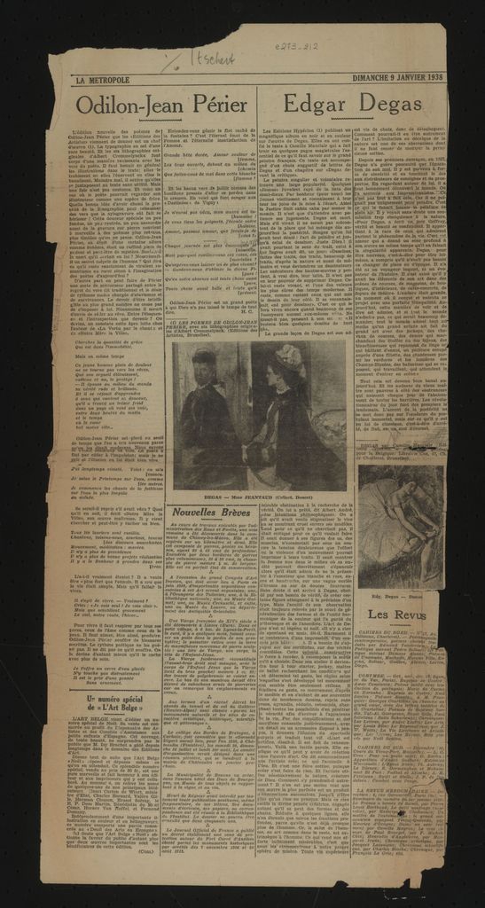 Απόκομμα, έντυπο, χαρτί, 54,0×25,0 εκ., όπου δημοσιεύεται, στα γαλλικά, άρθρο για την έκδοση της καταλόγου του Camille Mauclair έργων του Εdgar Degas από τις εκδόσεις Hyperion το 1938. Στην ίδια σελίδα, κριτική για την έκδοση ποιημάτων του Odilon-Jean Périer. Επάνω, επιγραφή. Στην άλλη όψη άρθρο για τον Βέλγο ζωγράφο Carl Itschert.