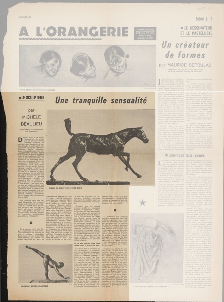Απόκομμα, έντυπο, χαρτί, 60,0×43,0 εκ., όπου δημοσιεύεται, στα γαλλικά, άρθρο της Michèle Beaulieu για το γλυπτικό έργο του Edgar Degas. Το άρθρο εντάσσεται σε αφιέρωμα της εφημερίδας στη μεγάλη αναδρομική έκθεση έργων του καλλιτέχνη που διοργανώθηκε στο Παρίσι το 1969. Στο πλαίσιο του ίδιου αφιερώματος δημοσιεύονται τα άρθρα: Hélène Adhémar “Edgar Degas. Les étapes de la perfection”, Pierre Pradel “Un génie polyvalent” και Maurice Serrulaz “Un créateur de formes”. Στις άλλες όψεις του τεκμηρίου δημοσιεύονται: απόσπασμα ημερολογίου του Γάλλου συγγραφέα Jules Roy, “Constat de Génie. 500 gravures contemporaines à la National”, Jean Dalevèze et Jean-Jacques Lévêque “Les Galeries”, “La boîte à couleurs” και “Pendant les vacances” με πολιτιστικά νέα και εκθέσεις της περιόδου.