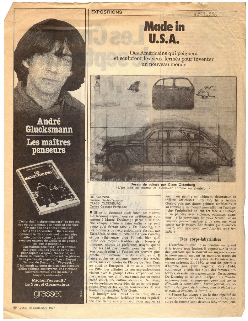 Απόκομμα, έντυπο, χαρτί, 2 φφ., 30,5×23,0 εκ., όπου δημοσιεύεται, στα γαλλικά, κριτική του France Huser για τις ατομικές εκθέσεις των Willem De Kooning και Claes Oldenburg στο Παρίσι το 1977. Περιέχει αποσπάσματα συνέντευξης.