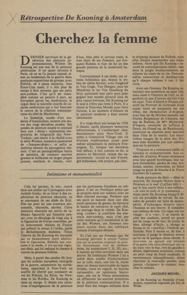 Απόκομμα, έντυπο, χαρτί, 50,0×33,5 εκ., όπου δημοσιεύεται, στα γαλλικά, άρθρο του André Chastel για τη διοργάνωση σειράς εκθέσεων στη Λισαβόνα με θέμα την Πορτογαλία την περίοδο της Αναγέννησης και της μεγάλωνς εξερευνητικών αποστολών. Στην ίδια σελίδα δημοσιεύονται επίσης τα άρθρα: Jacques Michel “Retrospective De Kooning a Amstedam. Cherchez la femme”, “Guide. L’éte” (συναυλίες στο Παρίσι, τη γαλλική επαρχία και το εξωτερικό), “Expositions” και “Rocailleurs et Bunkers, a l’Ifa – Variations sur le ciment”.