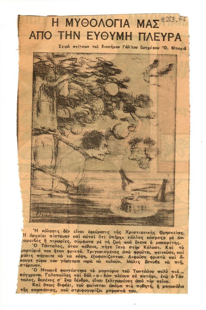 Απόκομμα, έντυπο, χαρτί, 16,5×9,7, εκ., όπου δημοσιεύεται, στα ελληνικά, αναπαραγωγή έργου του Γάλλου ζωγράφου Honoré Daumier με θέμα το μαρτύριο του Ταντάλου.