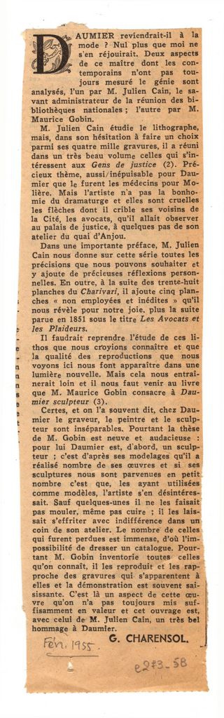 Απόκομμα, έντυπο, χαρτί, 24,5×7,0 εκ., όπου δημοσιεύεται, στα γαλλικά, βιβλιοκρισία του Georges Charensol για δύο νέες μονογραφίες, που πραγματεύονται το έργο του Γάλλου ζωγράφου και γλύπτη Honoré Daumier. Τον κατάλογο του Julien Cain “Les Gens De Justice”, εκδόσεις André Sauret, 1954 και τη μελέτης του Maurice Gobin “Daumier sculpteur”, εκδόσεις Pierre Cailler, 1952. Κάτω, επιγραφή με τα στοιχεία της δημοσίευσης.