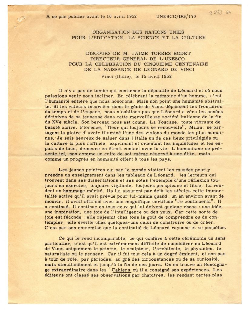 Κείμενο, δακτυλόγραφο, 5 φφ., χαρτί γραφομηχανής, 27,5×21,5 εκ. Ομιλία του Jaime Torres Bodet, με την ιδιότητα του Γενικού Διευθυντή της Unesco για τον εορτασμό της επετείου των 500 χρόνων από τη γέννηση του Λεονάρντο Ντα Βίντι στη γενέτειρά του το Vinci τον Απρίλιο του 1952. Διανεμήθηκε στους εκπροσώπους του τύπου.