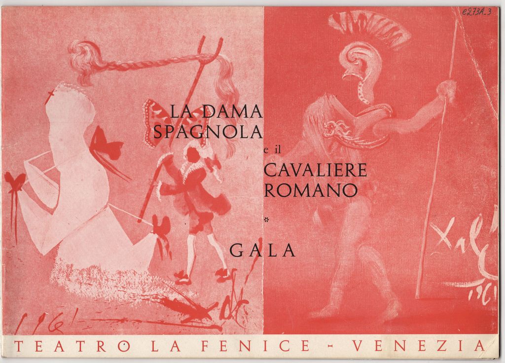 Έντυπο-πρόγραμμα της κωμικής όπερας «La dama spagnola e il cavaliere romano» χαρτί, 10 φφ., στα ιταλικά και αγγλικά, σε μουσική Alessandro Scarlatti και διασκευή Giulio Confalonieri και του divertimento cosmico “Gala” σε σκηνογραφία Salvador Dalí, χορογραφία Maurice Bejart, σε λιμπρέτο του Pierre Rhallys, που παρουσιάστηκαν στο Teatro la Fenice στη Βενετία τον Αύγουστο του 1961. Το έντυπο περιέχει κείμενα για τα έργα, επιγραμματικά βιογραφικά των συντελεστών και εικονογράφηση. Δίνονται τα ονόματα των συντελεστών, των πρωταγωνιστών και όλων των μουσικών της ορχήστρας. Ακόμη, διαφημίσεις των χορηγών: “Guerlain” και “Decca”.