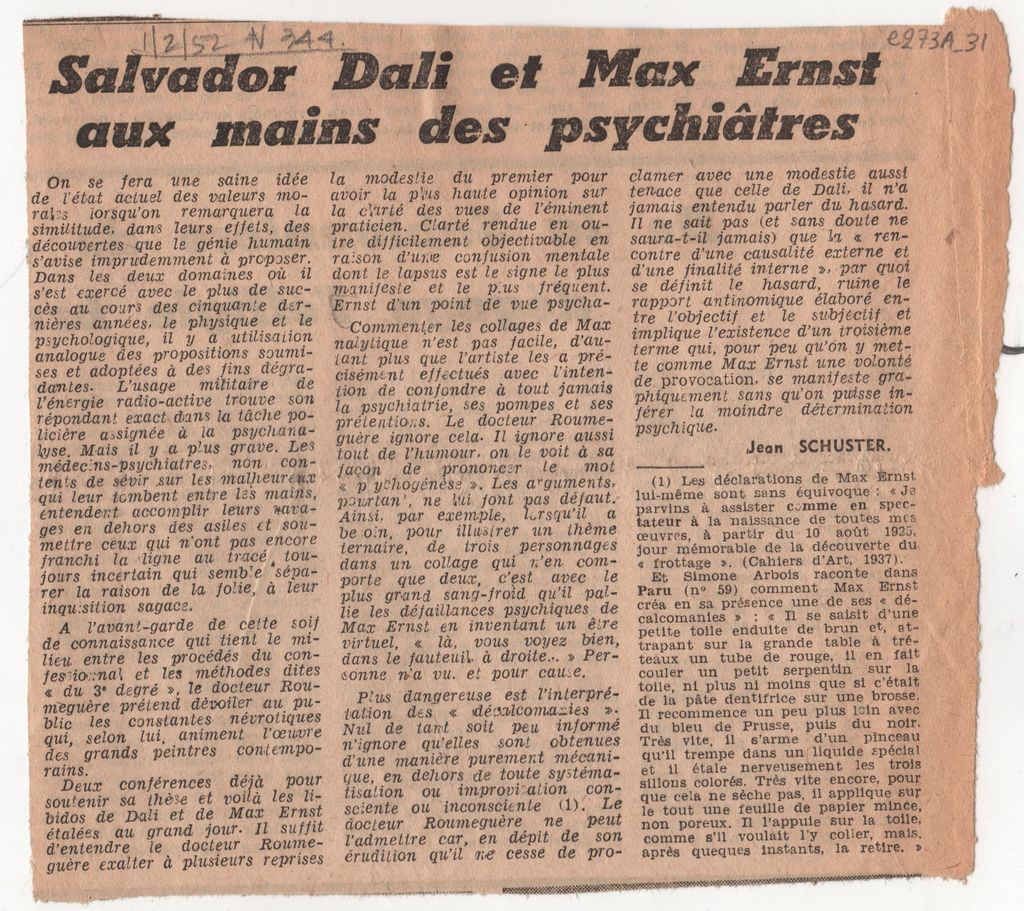 Απόκομμα, χαρτί, 14 x 16 εκ., στα γαλλικά, δημοσίευσης κριτικής αναφερόμενης σε διαλέξεις του ψυχιάτρου Roumeguère, στις οποίες ερμηνεύει το εικαστικό έργο των Salvador Dalí και Max Erst από την ιατρική του κατεύθυνση.