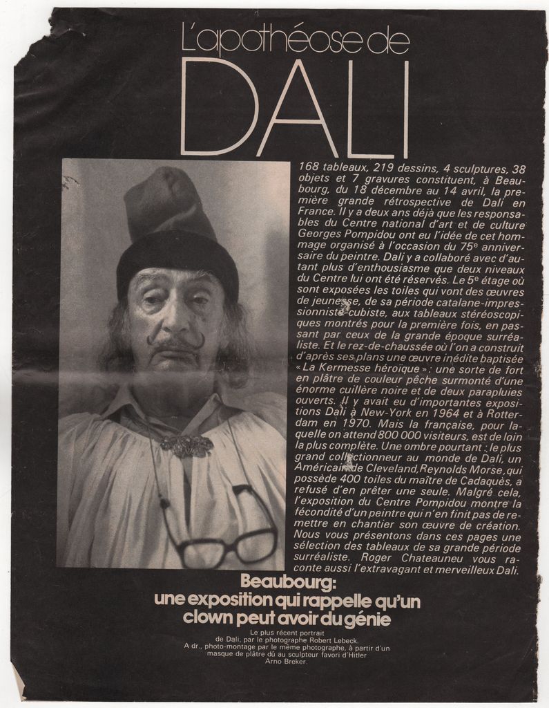 Απόκομμα, χαρτί, 5 φφ, 30 x 23 εκ., στα γαλλικά, δημοσίευσης άρθρου αναφερόμενου στον Salvador Dalí, με αφορμή αναδρομική έκθεση, η οποία διεξάγεται στο Centre Georges Pompidou στο Παρίσι.