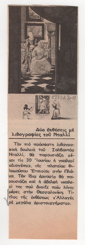 Απόκομμα, χαρτί, 15 x 4,5 εκ., στα ελληνικά, δημοσίευσης άρθρου το οποίο αναφέρεται σε εκθέσεις λιθογραφίας του Salvador Dalí, στην Γκαλερί Διογένης σε Αθήνα και Θεσσαλονίκη.