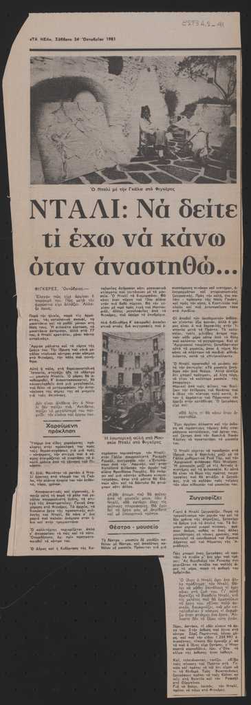 Απόκομμα, χαρτί ακανόνιστου μεγέθους, στα ελληνικά, δημοσίευσης άρθρου το οποίο αναφέρεται στην κατάσταση υγείας του Salvador Dalí. Δίνονται πληροφορίες για το μουσείο του στην γενέτειρά του Figueras.