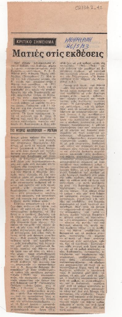 Απόκομμα, χαρτί, 32 x 10,5 εκ., στα ελληνικά, δημοσίευσης κριτικής έκθεσης του Roberto Matta, η οποία διεξάγεται στην Αίθουσα Τέχνης Μέδουσα στην Αθήνα. Δίνονται πληροφορίες για τα έργα που παρουσιάζονται και στοιχεία για το έργο του συνολικά. Εντάσσεται στη στήλη “Κριτικό Σημείωμα” του εντύπου.