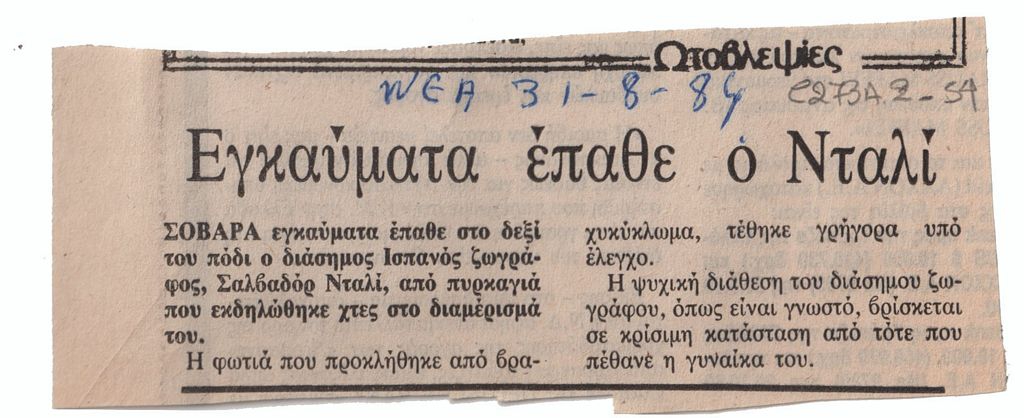 Απόκομμα, χαρτί, 5 x 11,5 εκ., στα ελληνικά, δημοσίευσης άρθρου το οποίο αναφέρεται σε εγκαύματα που προκλήθηκαν στον Salvador Dalí, εξαιτίας βραχυκυκλώματος στο σπίτι του.