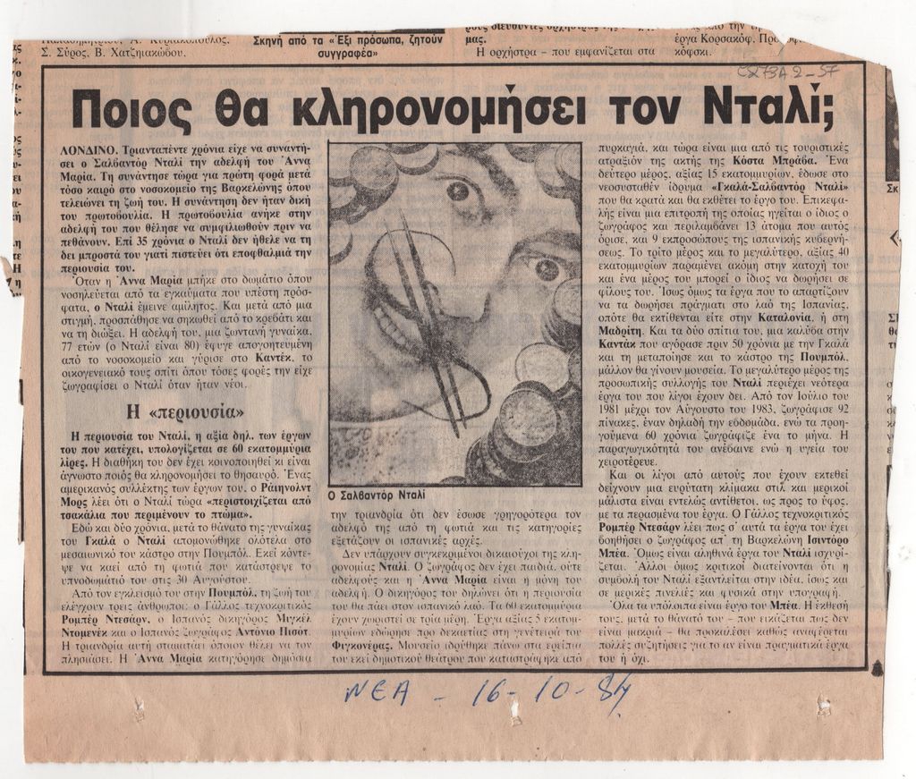 Απόκομμα, χαρτί, 18 x 21,5 εκ., στα ελληνικά, δημοσίευσης άρθρου το οποίο αναφέρεται στον Salvador Dalí. Ειδικότερα, σχολιάζεται η περιουσία του και ερευνάται που και πως θα κατανεμηθεί η κληρονομιά του.