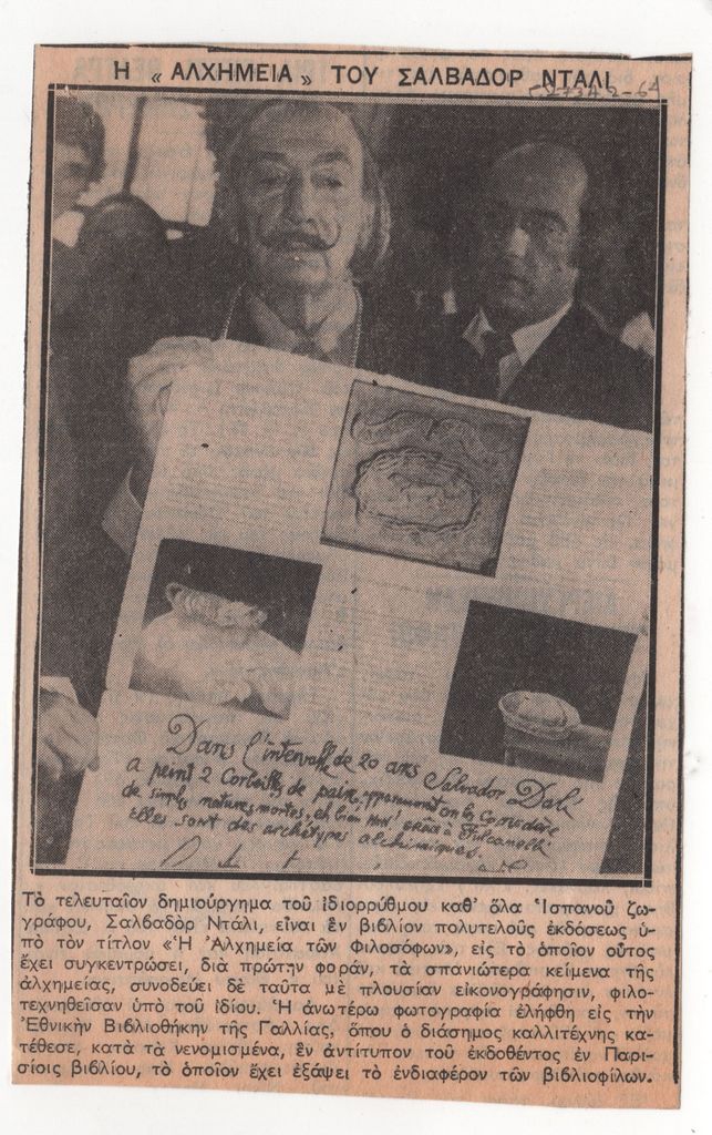 Απόκομμα, χαρτί, 15 x 10 εκ., στα ελληνικά, δημοσίευσης αναφερόμενης σε κυκλοφορία του Salvador Dalí, με τίτλο “Η Αλχημεία των Φιλοσόφων”, στο οποίο εικονογραφεί σημαντικά κείμενα αλχημείας.