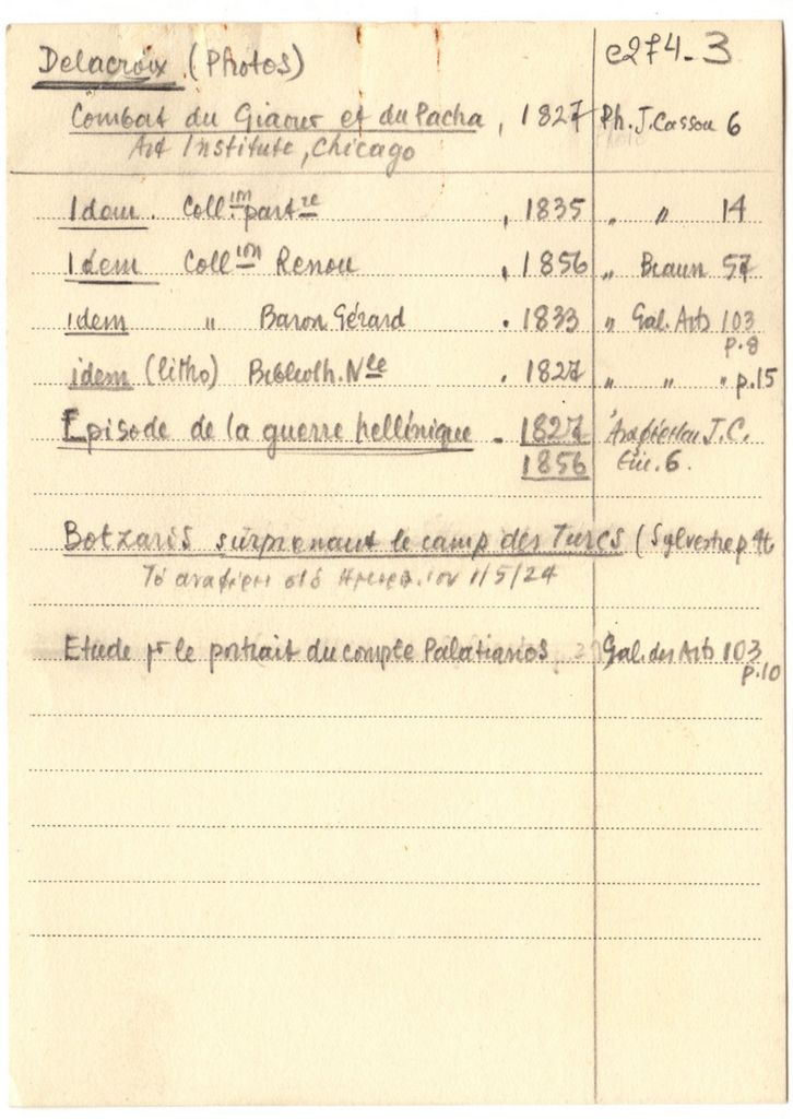 Χειρόγραφες με μολύβι στα γαλλικά σημειώσεις, χαρτόνι, 3 φφ, 15 x 11 εκ., του Τώνη Σπητέρη. Αναγράφονται πληροφορίες για φωτογραφίες έργων του Eugène Delacroix: συλλογές, χρονολόγηση, αναφορές στον Τύπο, φωτογράφοι.