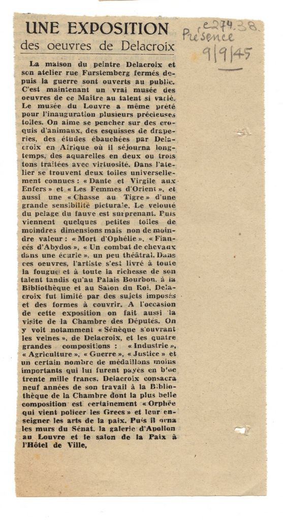 Απόκομμα, χαρτί, 18 x 9,5 εκ., στα γαλλικά, δημοσίευσης άρθρου το οποίο αναφέρεται σε έκθεση έργων του Eugène Delacroix, στο ομώνυμο μουσείο στο Παρίσι. Δίνονται πληροφορίες για τα έργα που παρουσιάζονται εκεί, αρκετά εκ των οποίων προέρχονται από τις συλλογές του Μουσείου του Λούβρου.