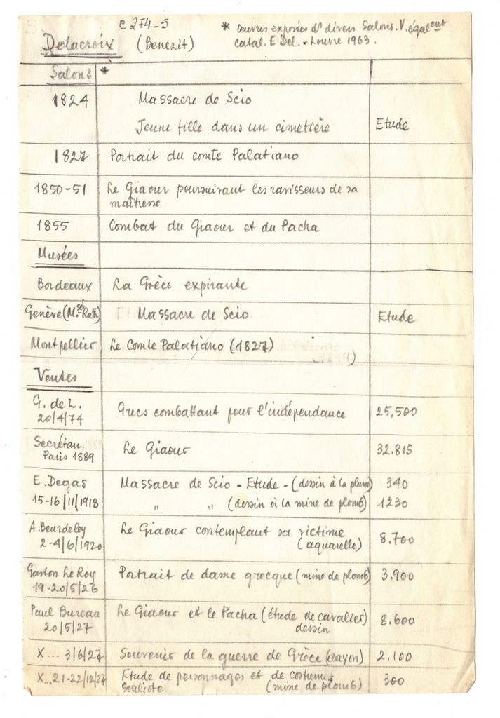 Χειρόγραφες σημειώσεις με μολύβι στα γαλλικά, χαρτί, 2 φφ, 21,5 x 14 εκ., του Τώνη Σπητέρη για τον Eugène Delacroix. Δίνονται πληροφορίες για έργα του καλλιτέχνη τα οποία παρουσιάστηκαν σε διάφορες εκθέσεις, που βρίσκονται σε συλλογές μουσείων, ενώ αναγράφονται πληροφορίες για πωλήσεις έργων του.