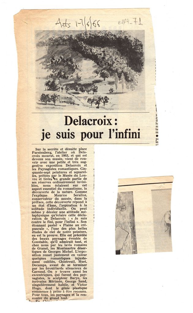 Απόκομμα, χαρτί ακανόνιστου μεγέθους, στα γαλλικά, δημοσίευσης αποσπάσματος άρθρου το οποίο αναφέρεται σε έκθεση E. Delacroix στο ατελιέ-μουσείο του. Δίνονται πληροφορίες για τα έργα που παρουσιάζονται σε αυτή, τα οποία προέρχονται από τις συλλογές του Λούβρου.