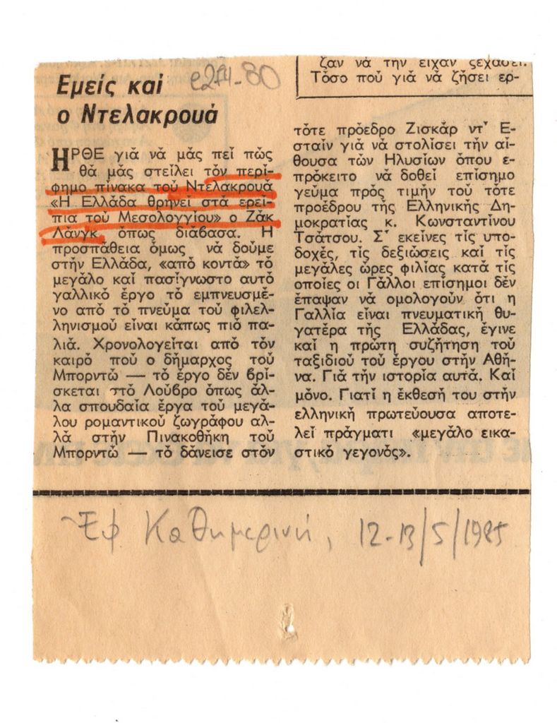 Απόκομμα, χαρτί, 12 x 10 εκ., στα ελληνικά, δημοσίευσης άρθρου το οποίο αναφέρεται σε έργο του E. Delacroix “Η Ελλάδα θρηνεί στα ερείπια του Μεσολογγίου”, το οποίο σύμφωνα με πληροφορίες φθάνει στην Ελλάδα όπου θα παρουσιαστεί σε έκθεση. Δίνεται ιστορικό για προηγούμενη προσπάθεια να έρθει στη χώρα το έργο αυτό.