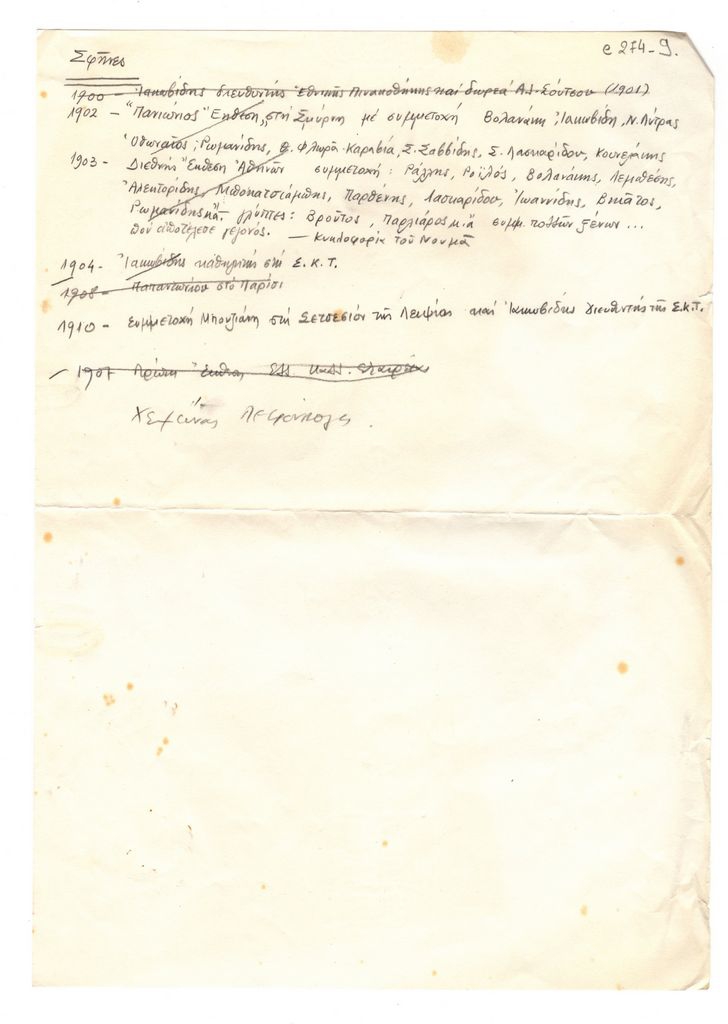 Χειρόγραφες σημειώσεις με μολύβι στα ελληνικά, χαρτί, 29,5 x 21 εκ., του Τώνη Σπτηέρη. Φέρει τον τίτλο “Σφήνες” και αναγράφεται χρονολόγιο με πληροφορίες για Έλληνες καλλιτέχνες.