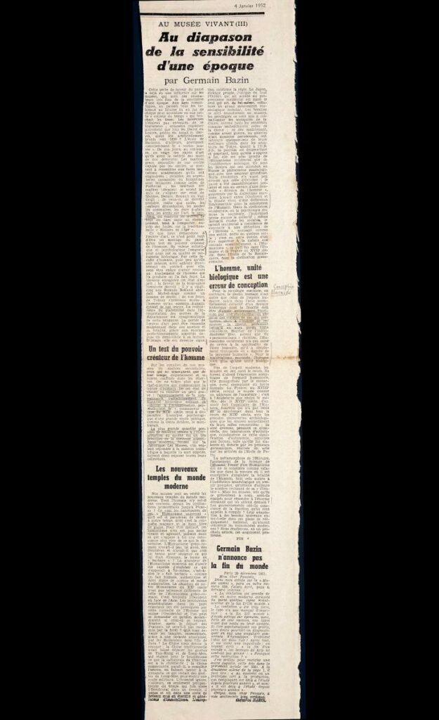 Απόκομμα περιοδικού, έντυπο, στα γαλλικά, χαρτί, διπλής όψης, 59,5×12 εκ., όπου δημοσιεύεται άρθρο του Γάλλου ιστορικού της τέχνης και τότε επιμελητή εκθέσεων στο Λούβρο. Το απόσπασμα εικονογραφείται. Στο κέντρο δεξιά, επιγραφή.