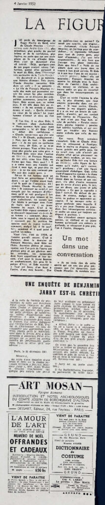 Απόκομμα του περιοδικού “Arts”, έντυπο, στα γαλλικά, χαρτί, διπλής όψης, 59,5×12 εκ., όπου δημοσιεύεται άρθρο του Γάλλου ιστορικού της τέχνης και τότε επιμελητή εκθέσεων στο Λούβρο. Το απόσπασμα εικονογραφείται. Στο κέντρο δεξιά, επιγραφή.