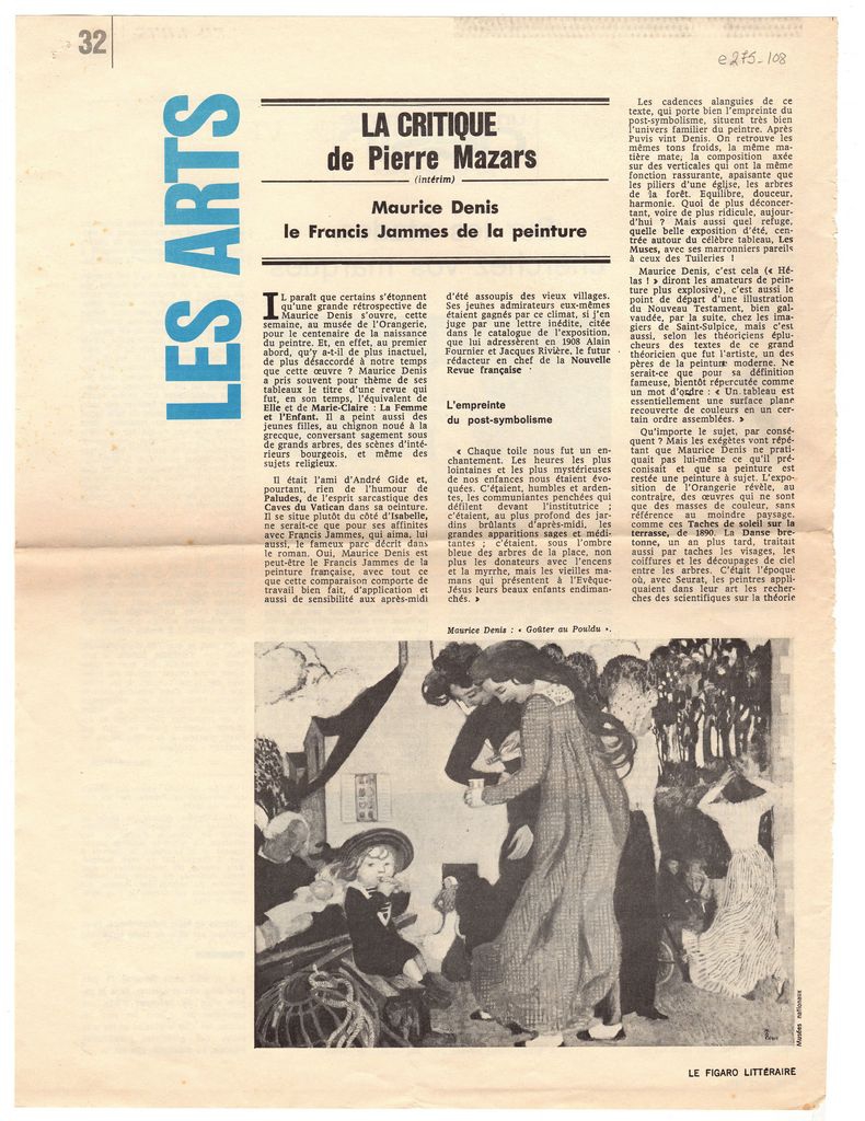 Απόκομμα, χαρτί, 36×27 εκ., στα γαλλικά, δημοσίευσης κριτικής αναδρομικής έκθεσης του Maurice Denis, η οποία διεξάγεται στην Orangerie στο Παρίσι, με αφορμή τη συμπλήρωση 100 χρόνων από τη γέννηση του καλλιτέχνη.