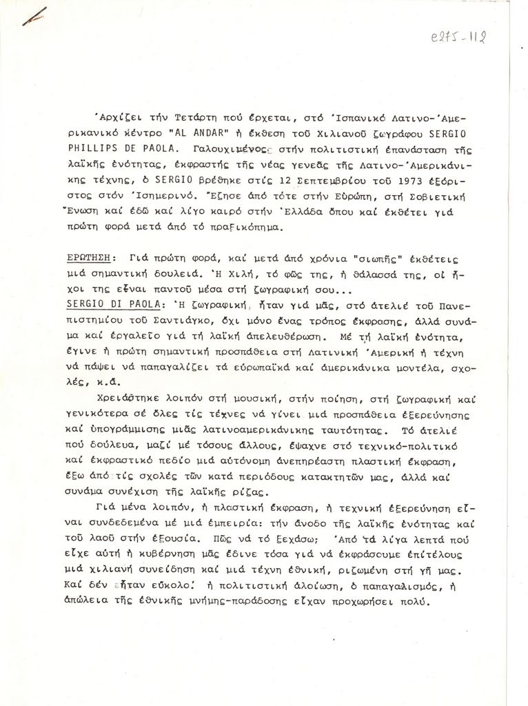 Φωτοαντίγραφο δακτυλόγραφου εντύπου, χαρτί, 3 φφ, 30×21 εκ., στα ελληνικά. Αναγράφεται συνέντευξη του Sergio Phillips di Paola, στο πλαίσιο έκθεσής του στο Πνευματικό και Διδακτικό κέντρο Al Andar στην Αθήνα.