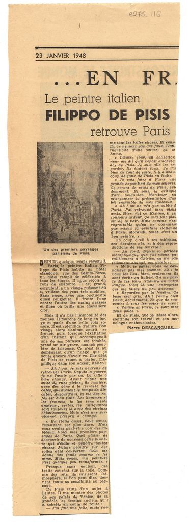 Απόκομμα, χαρτί ακανόνιστου μεγέθους, στα γαλλικά, δημοσίευσης άρθρου που μεταφέρει συνάντηση του κριτικού P. Descargues με τον Filippo de Pisis στο Παρίσι, με αφορμή ταξίδι του καλλιτέχνη εκεί. Ο de Pisis αναφέρθηκε στο εικαστικό του έργο, σε αναμνήσεις του από εκθέσεις στην Ιταλία και στις εντυπώσεις του από το Παρίσι.
