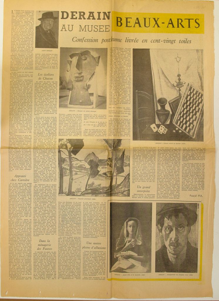 Απόκομμα, χαρτί, 60×43 εκ., στα γαλλικά, δημοσίευσης κριτικής αναδρομικής έκθεσης του André Derain, στο Μουσείο Μοντέρνας Τέχνης στο Παρίσι. Αναγράφονται πληροφορίες για το εικαστικό του έργο και σχόλια για τα έργα του.