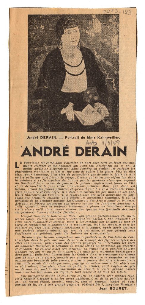 Απόκομμα, χαρτί, 23×10 εκ., στα γαλλικά, δημοσίευσης κριτικής έκθεσης του André Derain, η οποία διεξάγεται στην Galerie Berri στο Παρίσι.