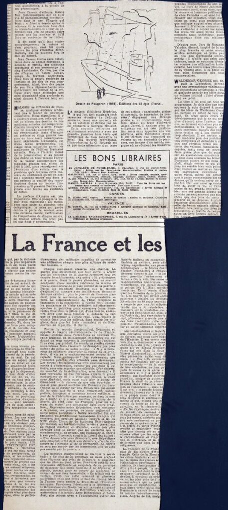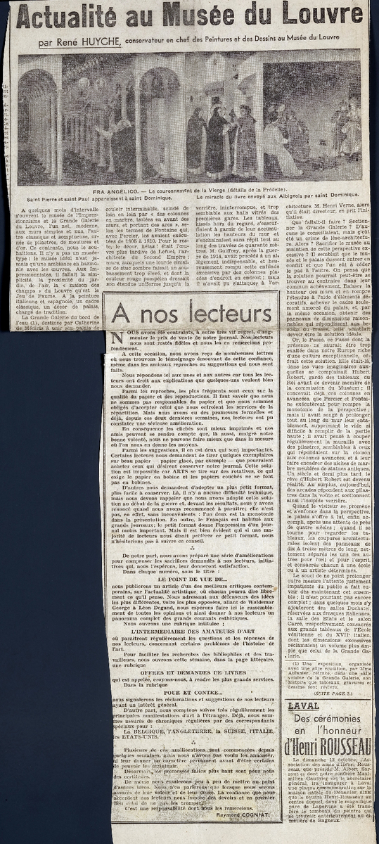 Απόκομμα, έντυπο, στα γαλλικά, χαρτί, διπλής όψης, 49×20,5 εκ., όπου δημοσιεύεται άρθρο του τότε έφορου της πινακοθήκης στο μουσείο του Λούβρου R. Huyghe, σχετικά με νέα για το μουσείο. Το απόσπασμα εικονογραφείται.