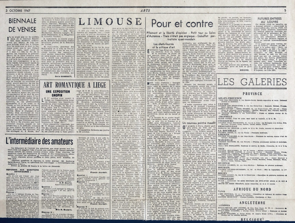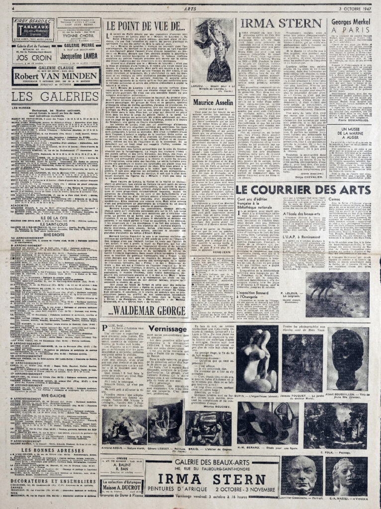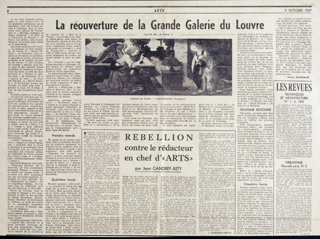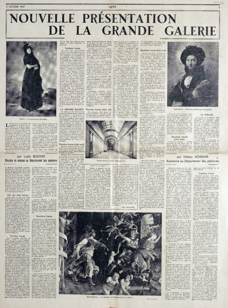 Απόκομμα, έντυπο, στα γαλλικά, χαρτί, δύο τμήματα διπλής όψης, 60×43,5 εκ. και 33×43,5 εκ., όπου δημοσιεύεται άρθρο της συντηρήτριας έργων τέχνης και επιμελήτριας H. Adhemar και της L. Bouthet. Το απόσπασμα εικονογραφείται. Πάνω δεξιά, επιγραφή.