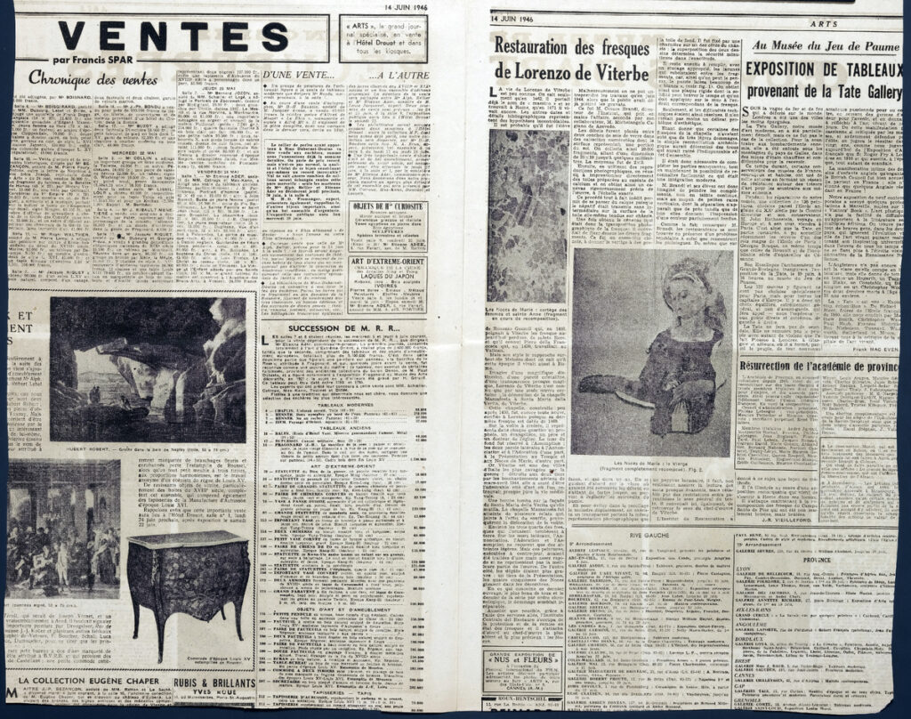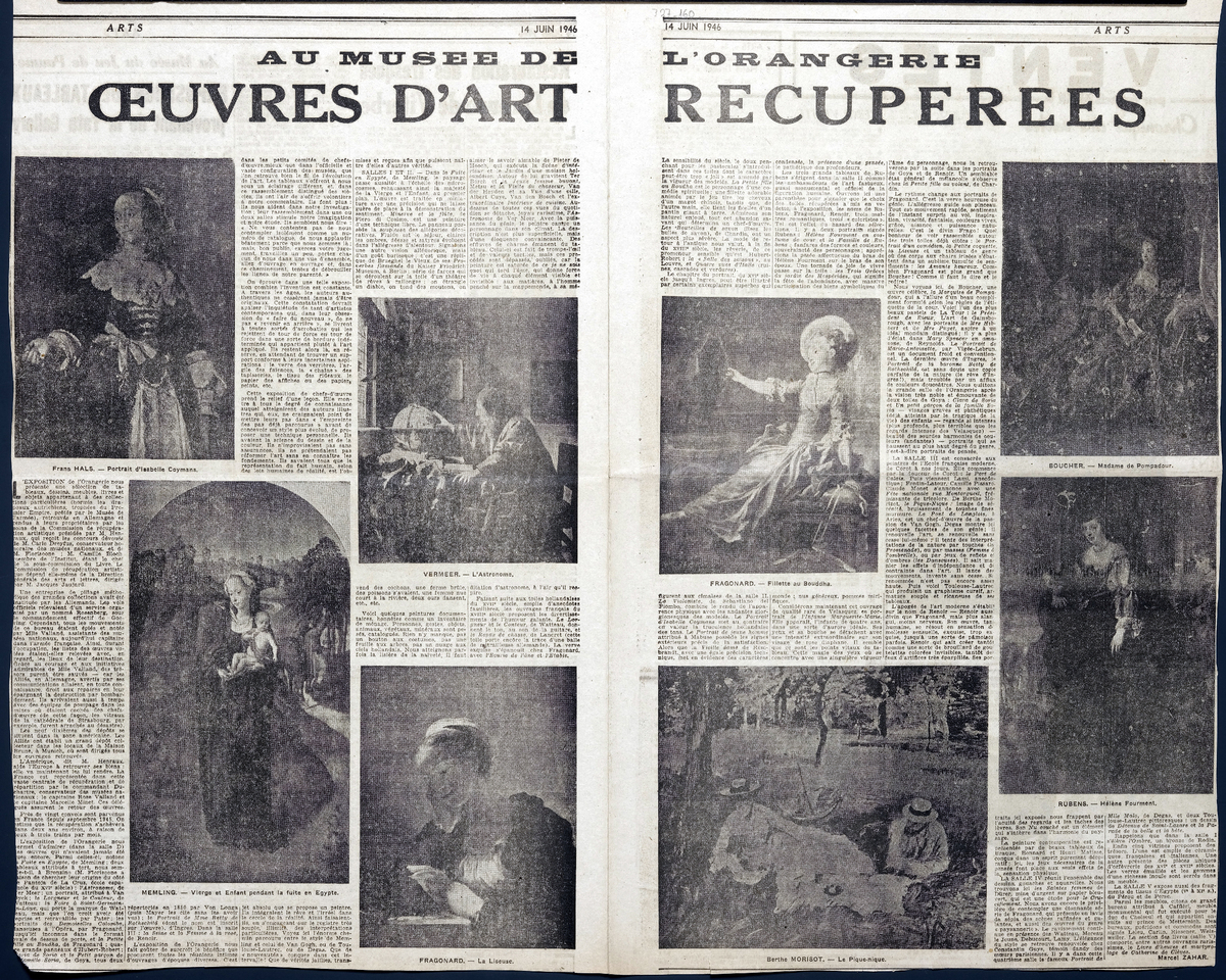 Απόκομμα, έντυπο, στα γαλλικά, χαρτί, διπλής όψης, 44×53 εκ., όπου δημοσιεύεται άρθρο για συντηρημένα έργα τέχνης από το Musée de l’ Orangerie του Παρισιού Το απόσπασμα εικονογραφείται.