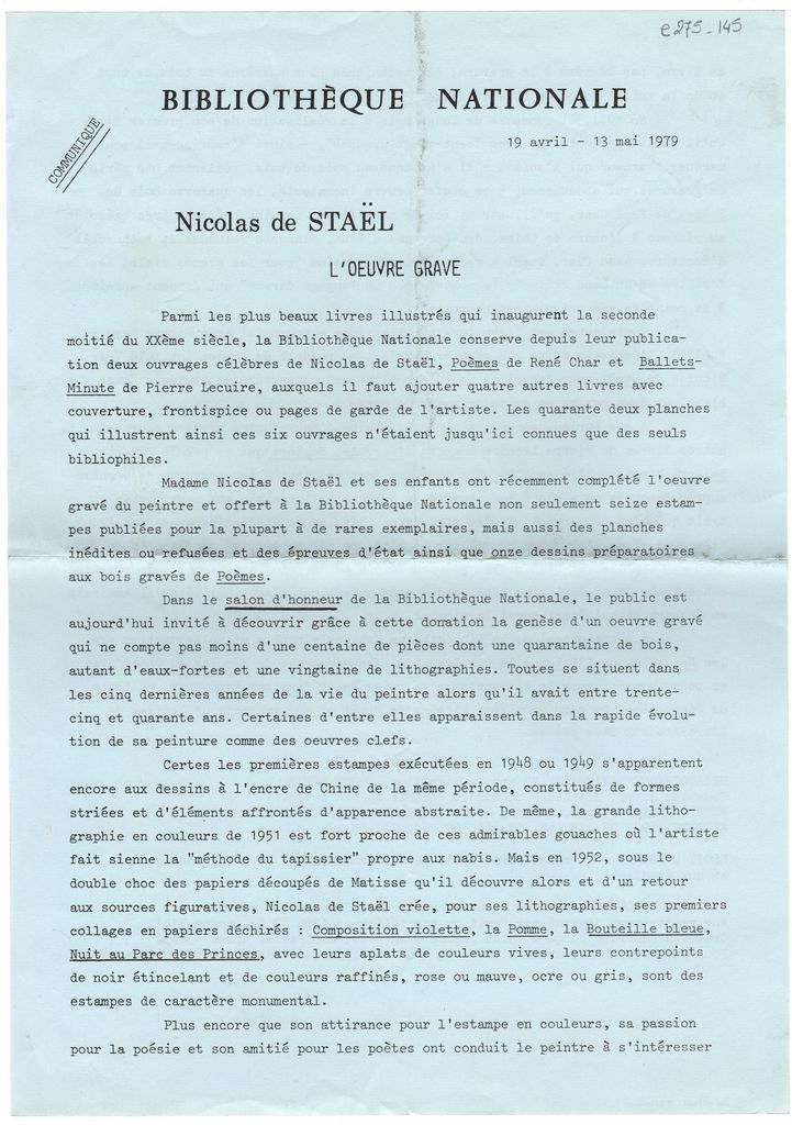 Φωτοαντίγραφο δακτυλόγραφου δελτίου τύπου έκθεσης του Nicholas de Staël, η οποία διεξάγεται στην Εθνική Βιβλιοθήκη του Παρισιού, χαρτί διπλής όψης, 30×21 εκ., στα γαλλικά. Περιέχει λεπτομέρειες για τη διοργάνωση και πληροφορίες για τα έργα που παρουσιάζονται.