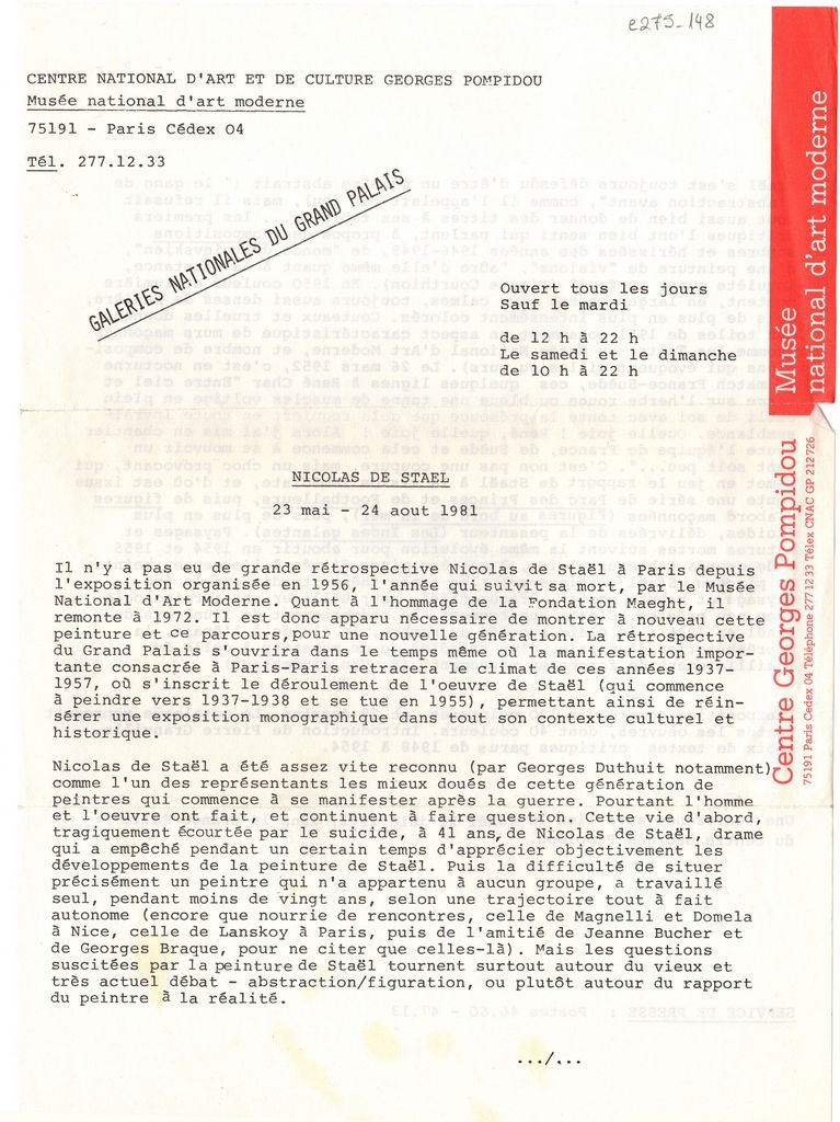 Φωτοαντίγραφο δακτυλόγραφου δελτίου τύπου αναδρομικής έκθεσης του Nicholas de Staël, στο Grand Palais στο Παρίσι, χαρτί διπλής όψης, 30×21 εκ., στα γαλλικά. Περιέχει πληροφορίες για τη διοργάνωση, βιογραφικά του καλλιτέχνη και λεπτομέρειες για τα έργα του που παρουσιάζονται σε αυτή.