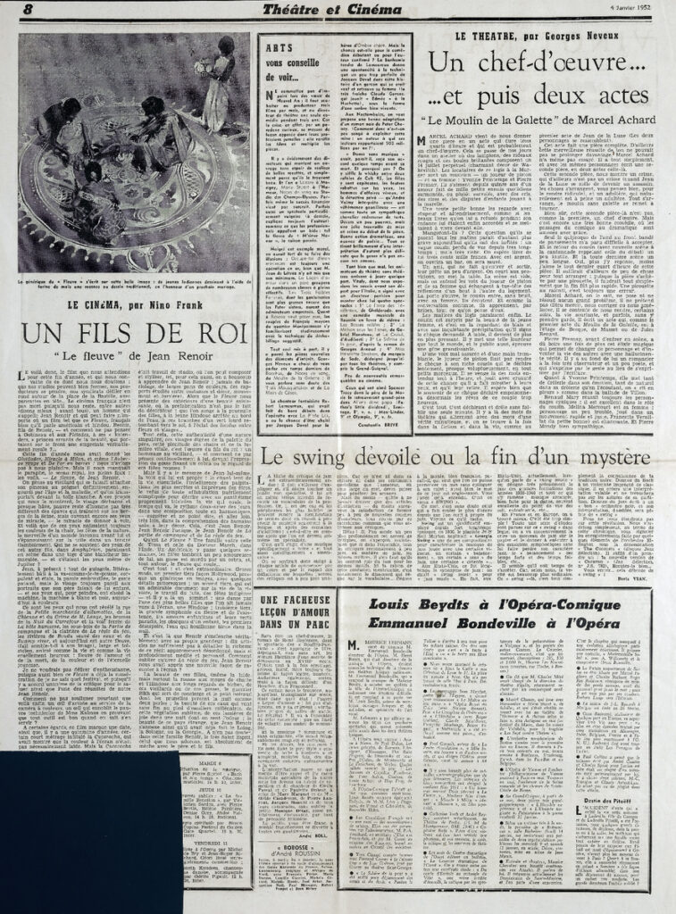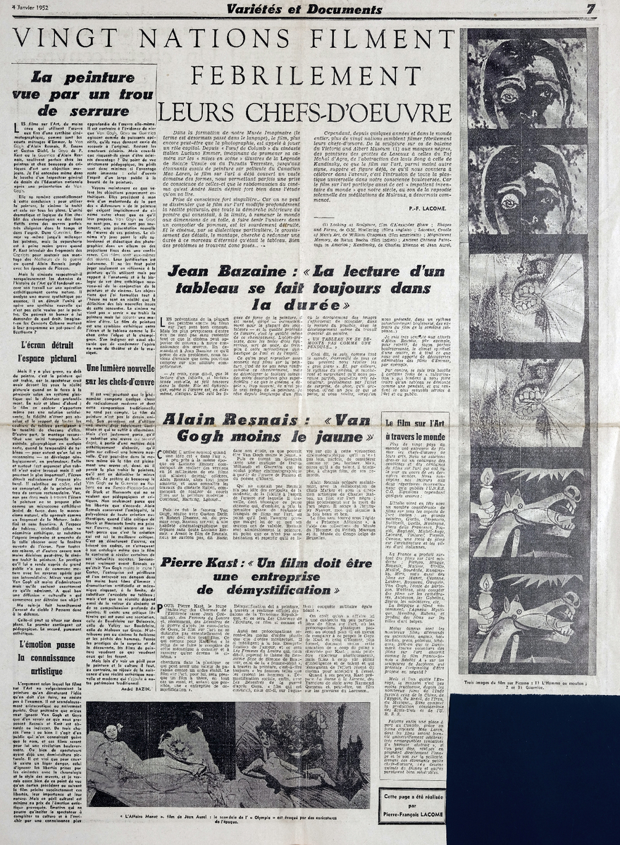 Απόκομμα, έντυπο, στα γαλλικά, χαρτί, διπλής όψης, 59,5×43 εκ., όπου δημοσιεύεται άρθρο αναφορικά με το γύρισμα κινηματογραφικών ταινιών από είκοσι χώρες. Το απόσπασμα εικονογραφείται. Στο ίδιο απόκομμα: A. Bazin “La peinture vue par un trou de serrure”.