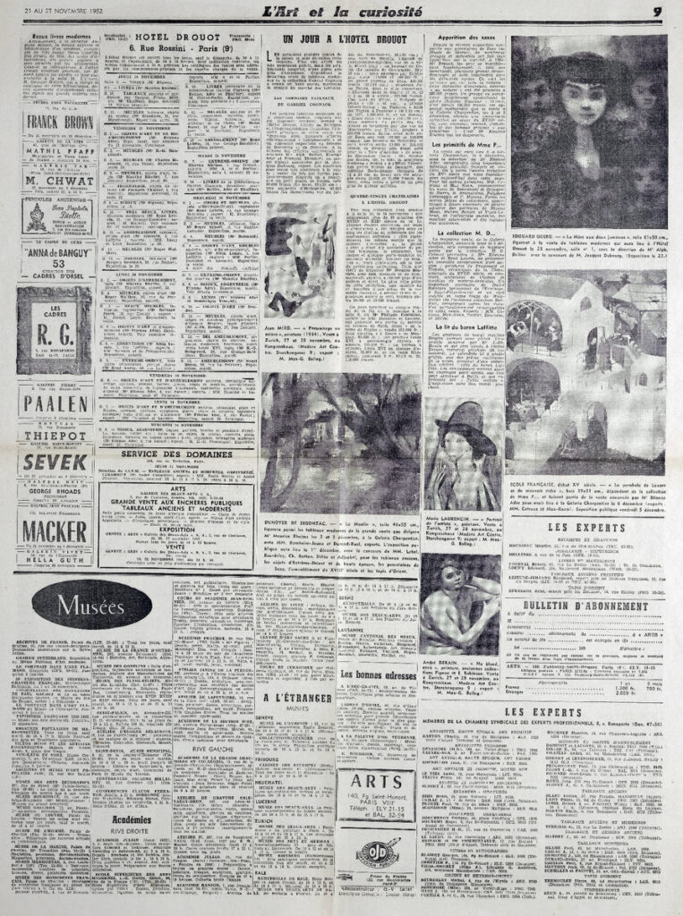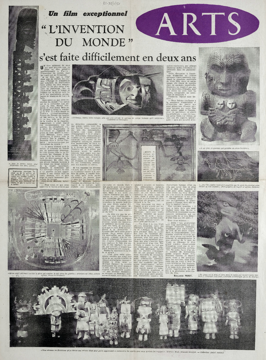 Απόκομμα του περιοδικού “Arts”, έντυπο, 21-27/11/1957, στα γαλλικά, χαρτί, διπλής όψης, 59,5×43 εκ., όπου δημοσιεύεται άρθρο του Γάλλου ποιητή B. Peret, αναφορικά με το γύρισμα μιας ταινίας σε δύο χρόνια. Το απόσπασμα εικονογραφείται. Πάνω από τον τίτλο, επιγραφή με τα στοιχεία έκδοσης.