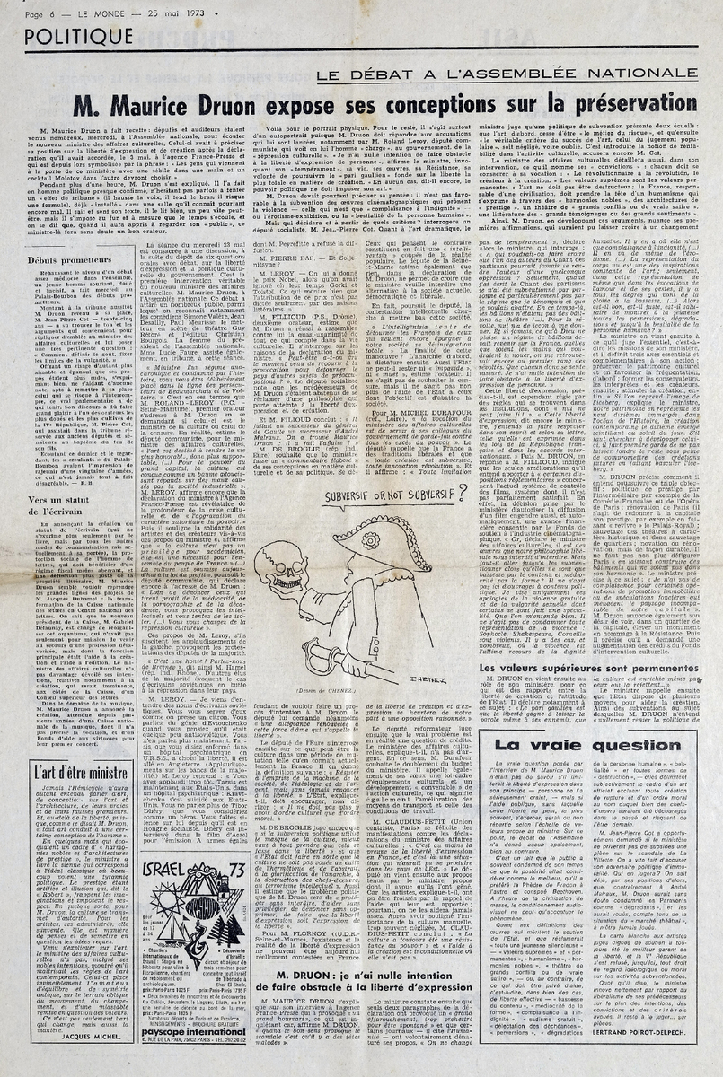 Απόκομμα της εφημερίδας “Le Monde”, έντυπο, στα γαλλικά, χαρτί, διπλής όψης, 50×33 εκ., όπου δημοσιεύεται άρθρο του Γάλλου συγγραφέα σχετικά με τις απόψεις του για την διατήρηση της πολιτιστικής κληρονομιάς. Το απόσπασμα εικονογραφείται.
