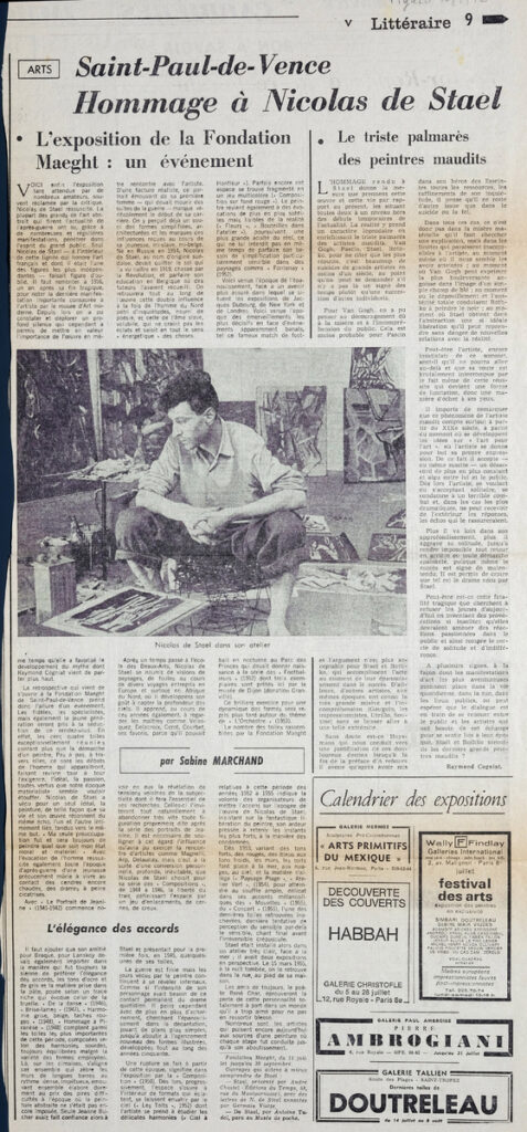 Απόκομμα, χαρτί, 60×27 εκ., στα γαλλικά, δημοσίευσης άρθρου αφιερωμένου στον Nicholas de Staël, με αφορμή έκθεση αφιερωμένη στον καλλιτέχνη, η οποία διεξάγεται στην Fondation Maeght στο Παρίσι.