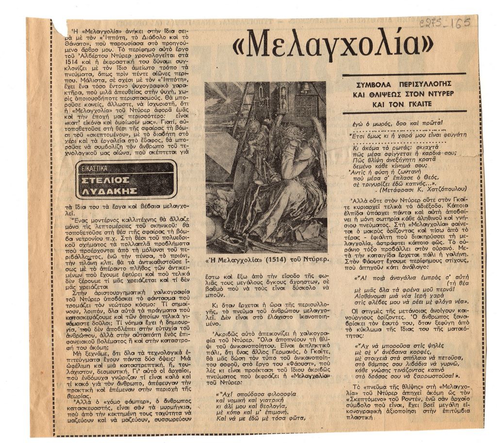 Απόκομμα, χαρτί, 19×21 εκ., στα ελληνικά, δημοσίευσης άρθρου αφιερωμένου στο έργο “Μελαγχολία” του Albrecht Dürer. Εντάσσεται στη στήλη “Εικαστικά” του εντύπου.