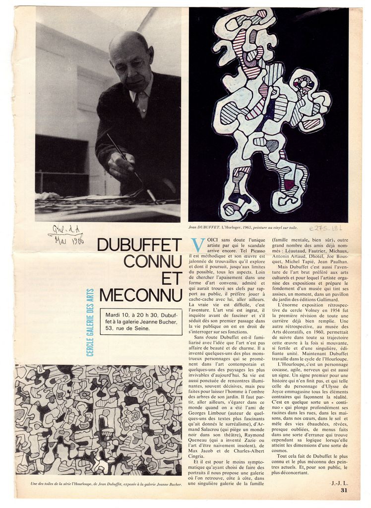 Απόκομμα, χαρτί, 34×24 εκ., στα γαλλικά, δημοσίευσης κριτικής έκθεσης του Jean Dubuffet στην Galerie Jeanne Bucher στο Παρίσι.